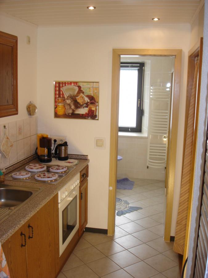 Komplett ausgestattete Küche mit Kühlschrank, Elektroherd mit 4 Platten und Backrohr.